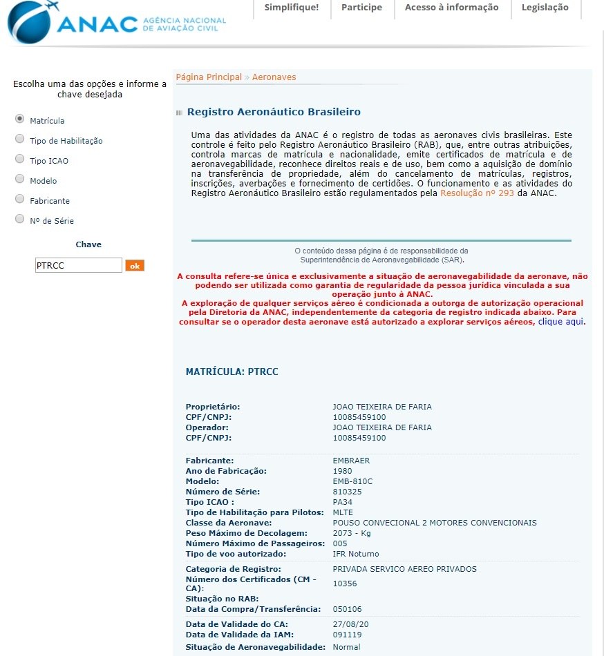 Antes desta aeronave, o médium tinha uma Piper, fabricada no ano de 2004. Importado dos Estados Unidos, o modelo é avaliado em cerca de R$ 1,2 milhão.